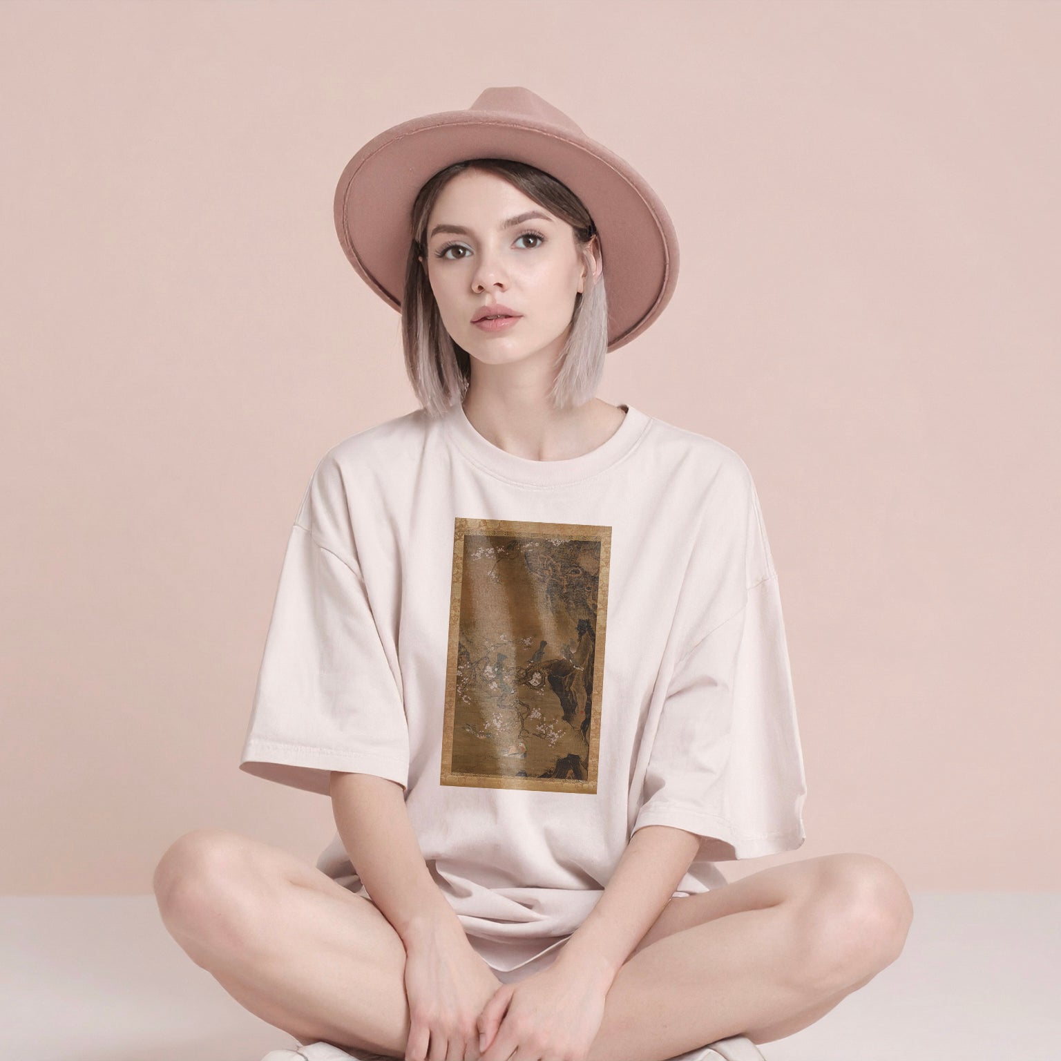 This work represents "Spring" from a four-panel series themed on the four seasons. Peach blossoms bloom in a mountain valley, with birds such as larks, pigeons, mandarin ducks, and black-throated laughing thrushes intricately and vividly depicted on the branches. Considered Lü Ji’s greatest masterpiece, it also influenced Japanese art from the Muromachi period onward.