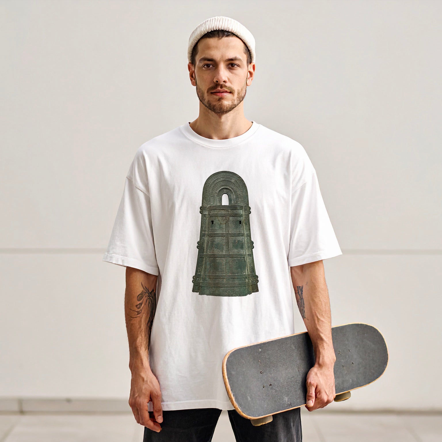 This bell-shaped bronze (Dōtaku) was created during the late Yayoi period (1st–3rd century). This type represents the latest style among Dōtaku, characterized by finely incised lines forming hook-shaped partitions and a thin hanging section. Some examples are notably large and lack the ability to produce sound, distinguishing them from earlier types.