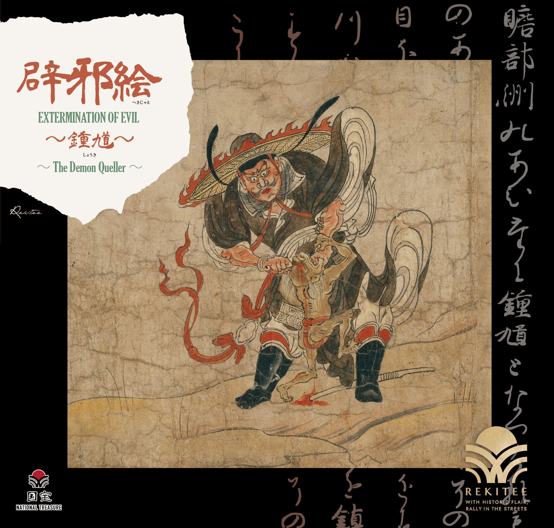 This artwork shows Shōki, who exterminates evil spirits that cause harm and illness. According to legend, he appeared in a dream of Emperor Xuanzong of the Tang Dynasty, destroyed a plague demon, and cured the emperor’s illness. In Japan, Shōki became a popular figure on Boys’ Day banners and samurai dolls. In this scene, he is shown pinning down a plague demon with his left hand and pulling out its eye with his right.